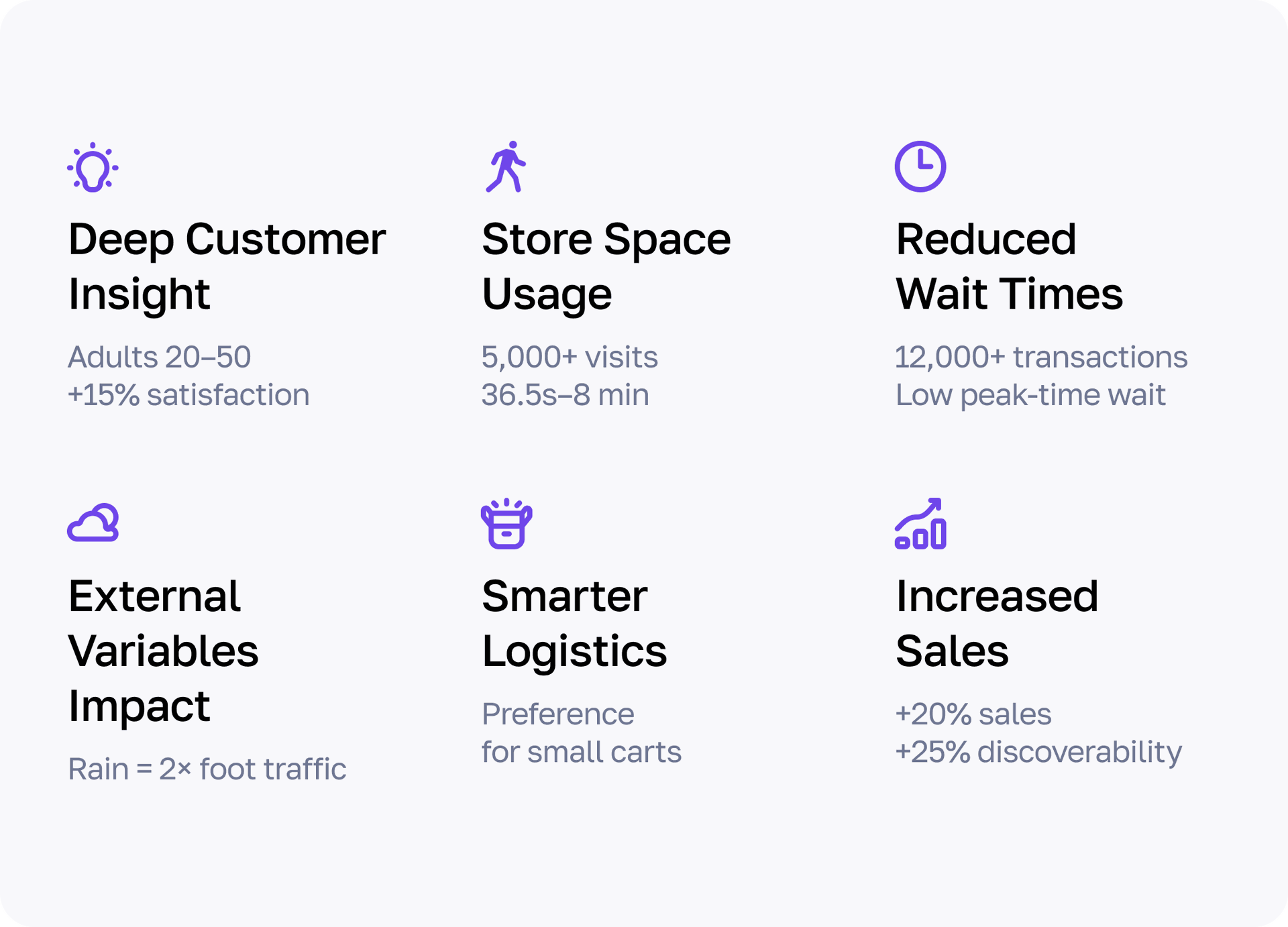Behavior data showed a strong correlation between external conditions—like weather— and store traffic. On rainy days, foot traffic nearly doubled, which allowed the supermarket to better forecast demand and adjust staffing and promotions accordingly.