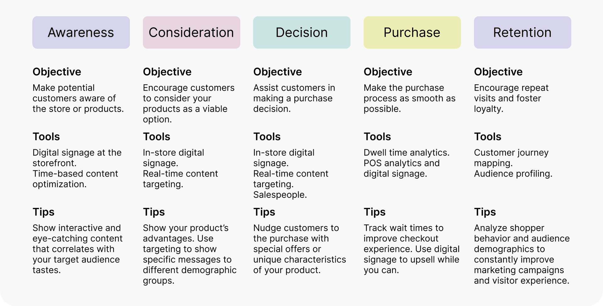 - Strumenti: Per aiutare i clienti a prendere una decisione informata, il digital signage mirato può essere utilizzato in aree ad alta decisione. Il digital signage può confrontare prodotti, mostrare testimonianze dei clienti o offrire offerte a tempo limitato per orientare la decisione. L'analisi dei dati dei clienti consente di identificare quali contenuti funzionano meglio e ottimizzarli in tempo reale. Inoltre, è possibile distribuire chioschi interattivi all'interno del negozio, consentendo ai clienti di esplorare le gamme di prodotti, leggere recensioni o vedere i prodotti in azione.